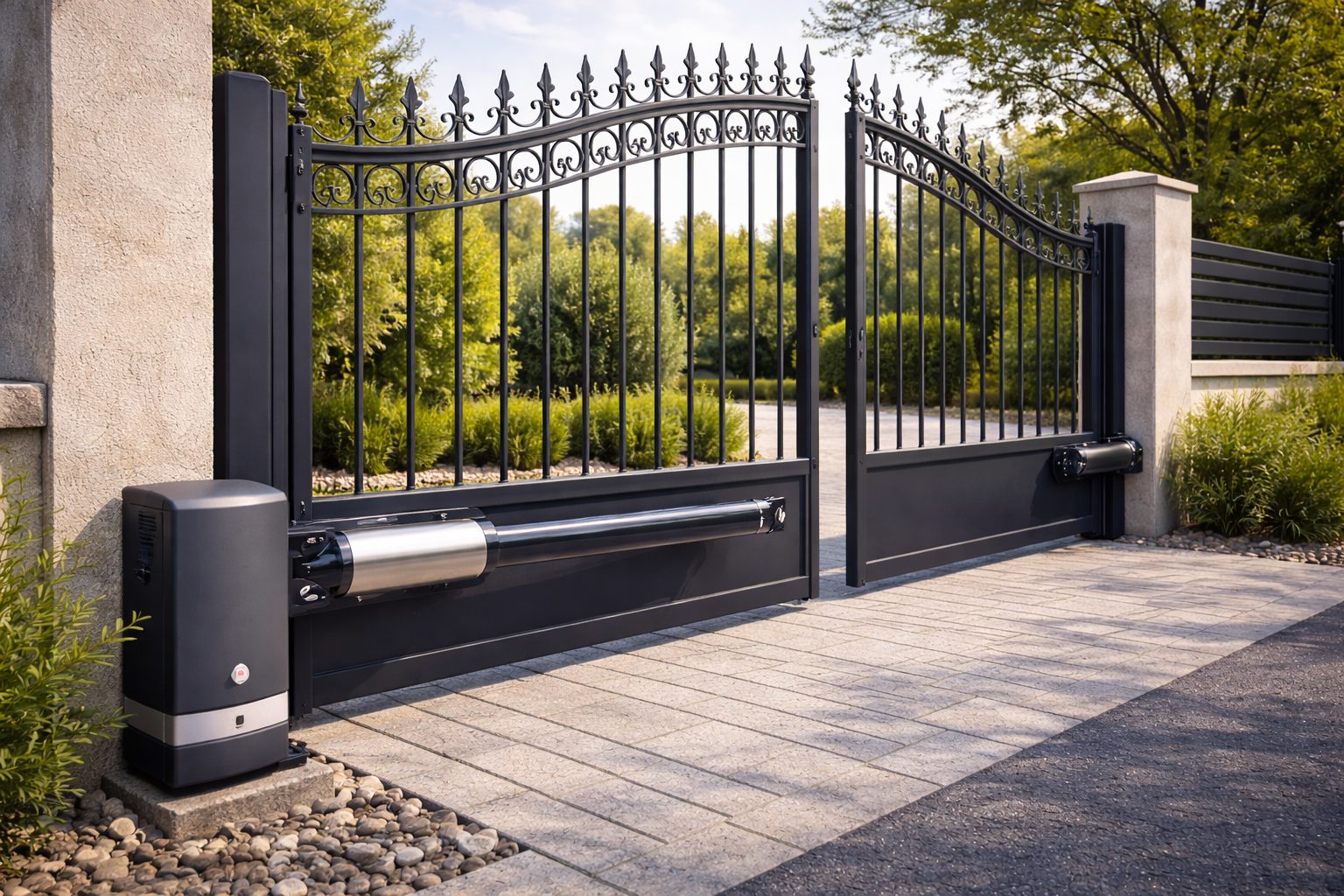 Fadini se distingue par ses motorisations hydrauliques enterrées, particulièrement adaptées aux portails lourds et aux zones exposées au vent. La technologie hydraulique garantit une ouverture et une fermeture fluides, silencieuses et fiables dans le temps, même en usage intensif.