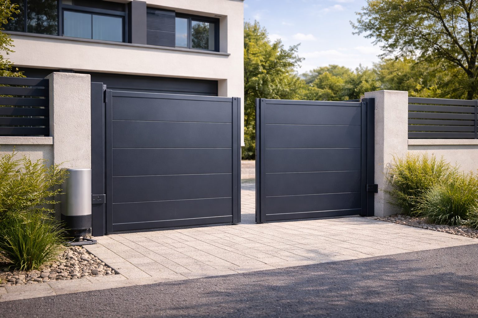 Contrairement au fer forgé ou au bois, il ne rouille pas, ne gonfle pas et ne se déforme pas avec la chaleur. Un portail aluminium motorisé, c’est aussi un confort d’usage au quotidien : ouverture par télécommande, clavier à code ou smartphone, compatible avec votre système domotique.